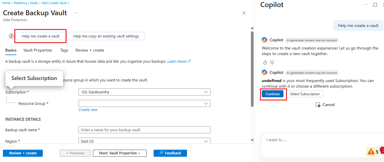 To create a Backup vault using Resiliency Copilot, follow these steps: