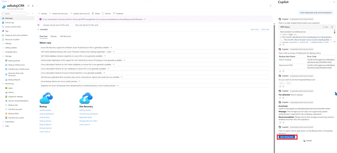 On the Copilot pane, select Open Backup Item to view the error code descriptions and recommendations with guided steps to fix issues.