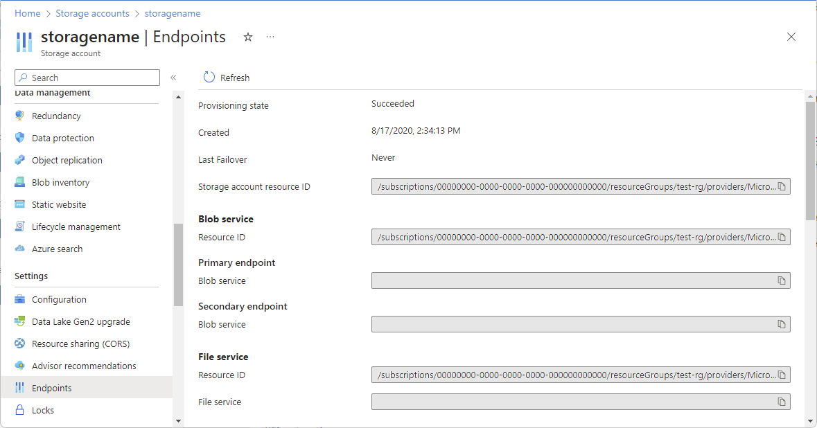 | Resource group | /subscriptions/00000000-0000-0000-0000-000000000000/resourceGroups/Example-Storage-rg |