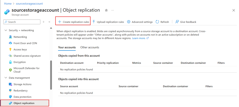 In the Azure portal, navigate to the storage account you want to modify. In the left navigation pane, expand the Data Management group and select Object replication. The Your accounts tab is selected by default, displaying all existing OR policies for the storage account.