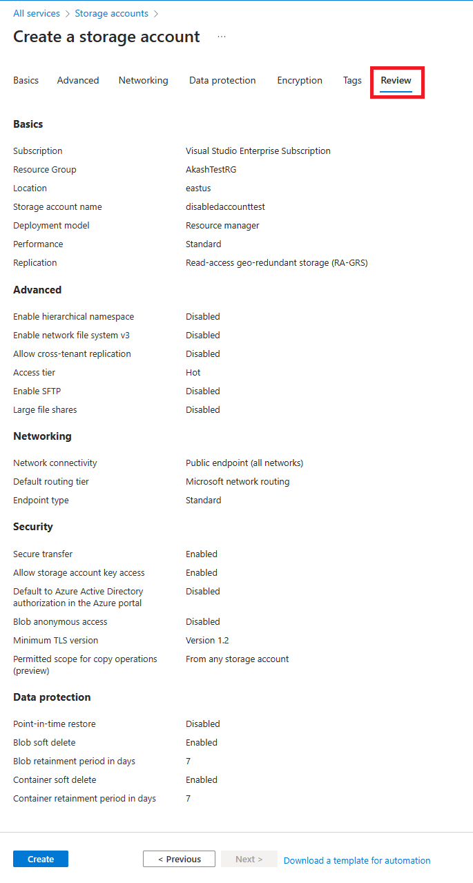 The following image shows the Review tab data prior to the creation of a new storage account.