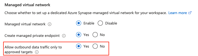 After you choose to associate a Managed workspace Virtual Network with your workspace, you can protect against data exfiltration by allowing outbound connectivity from the Managed workspace Virtual Network only to approved targets using Managed private endpoints. Select Yes to limit outbound traffic from the Managed workspace Virtual Network to targets through Managed private endpoints.