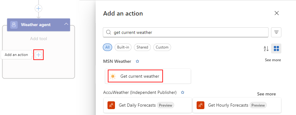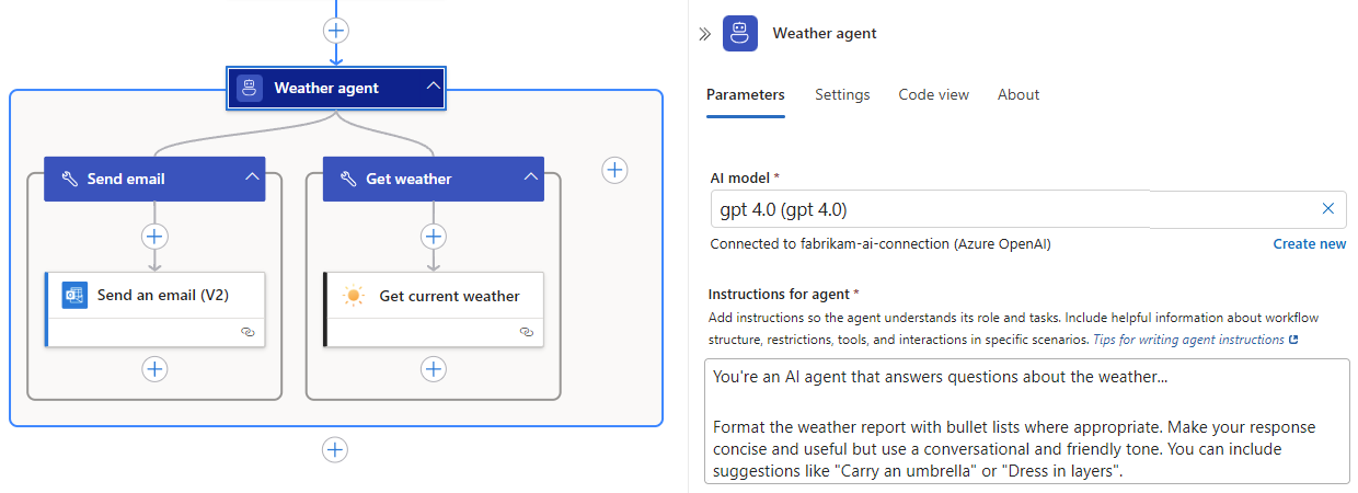 The following diagram shows a weather agent that can get the weather forecast and send that forecast in email: