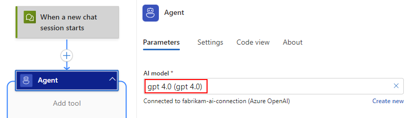 By default, your agent loop automatically uses the Azure OpenAI model available in your logic app's region. Some regions support gpt-4o-mini, while others support gpt-5o-mini.