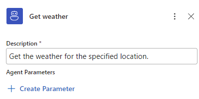 Get the weather for the specified location.Under Description, the Agent Parameters section applies only for specific use cases. For more information, see Create agent parameters.