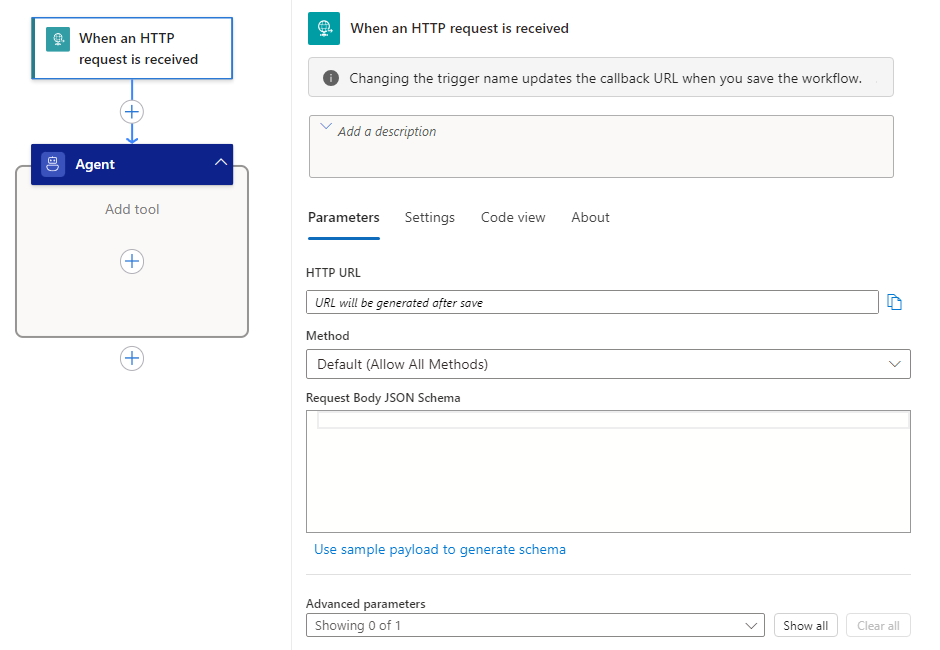 The designer shows a partial workflow with the trigger named When an HTTP request is received. Under the trigger, an empty Agent action named Default Agent appears. For this scenario, you don't need any other trigger setup.