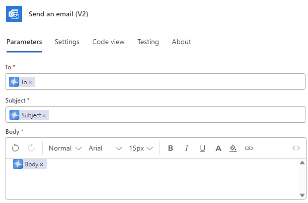 Follow the earlier general steps to create agent parameters for the parameter values in the Send an email (V2) action.