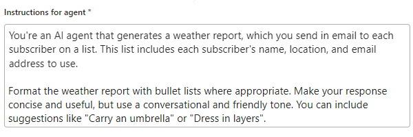 For this example, the weather agent example uses the following sample instructions where you later provide a subscriber list with your own email address for testing: