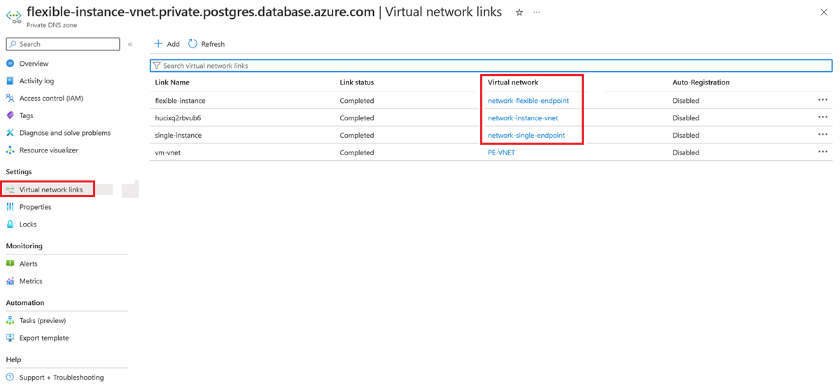 Select the private DNS zone on your single server's private endpoint. Check whether the VNets of the single server and the flexible server appear in the virtual network links. If they aren't, complete the steps that are described earlier to add the links to the virtual networks of the single server and the flexible server to this private DNS zone.