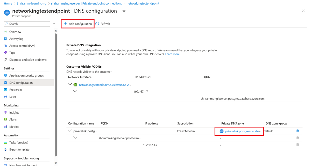 Go to the private endpoint for your single server and select the DNS configuration pane. Check whether a private DNS zone is attached to this endpoint. If not, attach a private DNS zone by selecting the Add Configuration button.