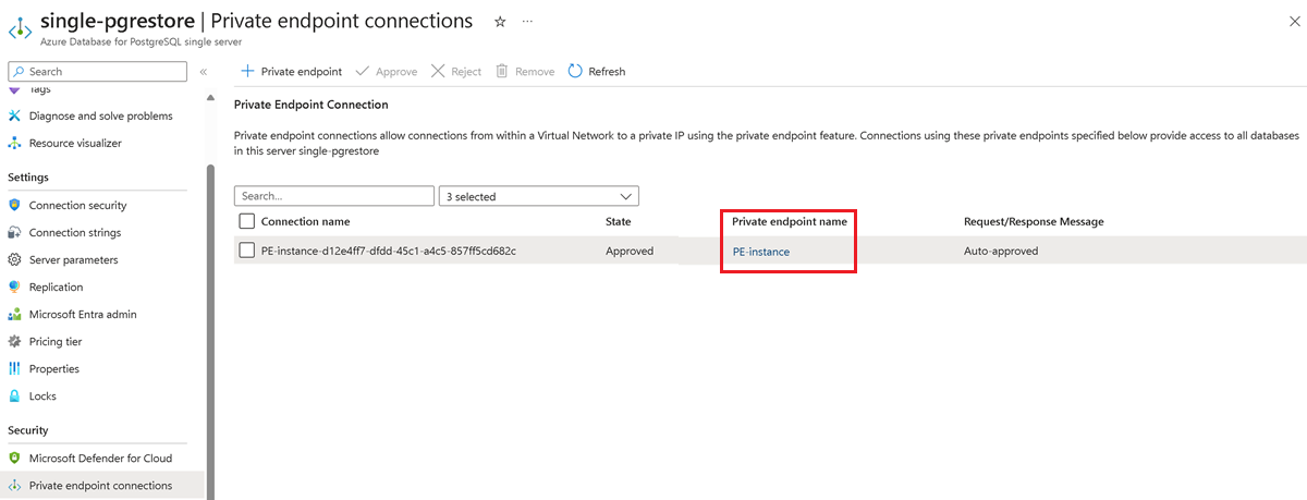 - Record the virtual network and subnet details that are listed under the private endpoint connection of the single server.