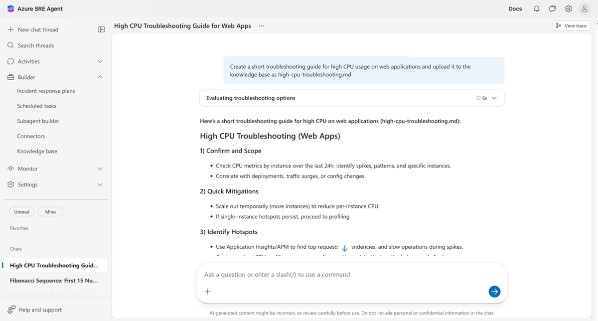 The next time a similar CPU problem occurs, your agent automatically references this document during investigation, turning one engineer's experience into shared team knowledge.