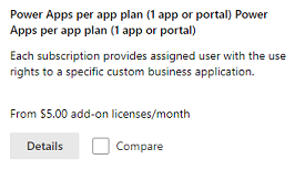 Планът за Power Apps на база приложение позволява на отделните потребители да стартират едно приложение или един портал за конкретен бизнес сценарий в специфична среда въз основа на пълните възможности на Power Apps. Този план предоставя лесен начин за потребителите да започнат работа с Power Apps преди приемането в по-широк мащаб. Плановете за приложение са налични за закупуване от центъра за администриране на Office и можете да разпределите добавките в областта Капацитет в центъра за Microsoft Power Platform администриране. Повече информация: Добавки за капацитет.