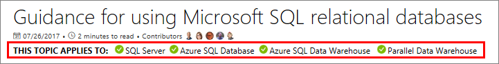 Each SQL Server article contains an applies-to include file after the title. This indicates what areas or versions of SQL Server the article applies to.