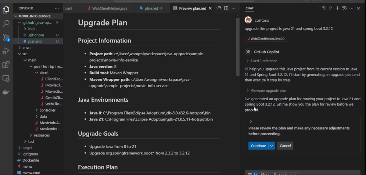 GitHub Copilot modernization analyzes the Java project in the current workspace, including its JDK, build tools, and dependencies. The tool generates a plan.md file that outlines the following planned changes: