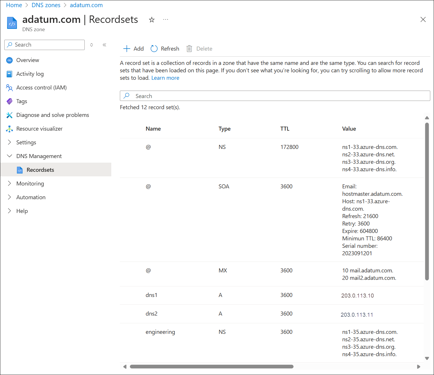It's important to understand the difference between DNS record sets and individual DNS records. A record set is a collection of records in a zone that have the same name and are the same type. For more information, see Create DNS record sets and records by using the Azure portal.