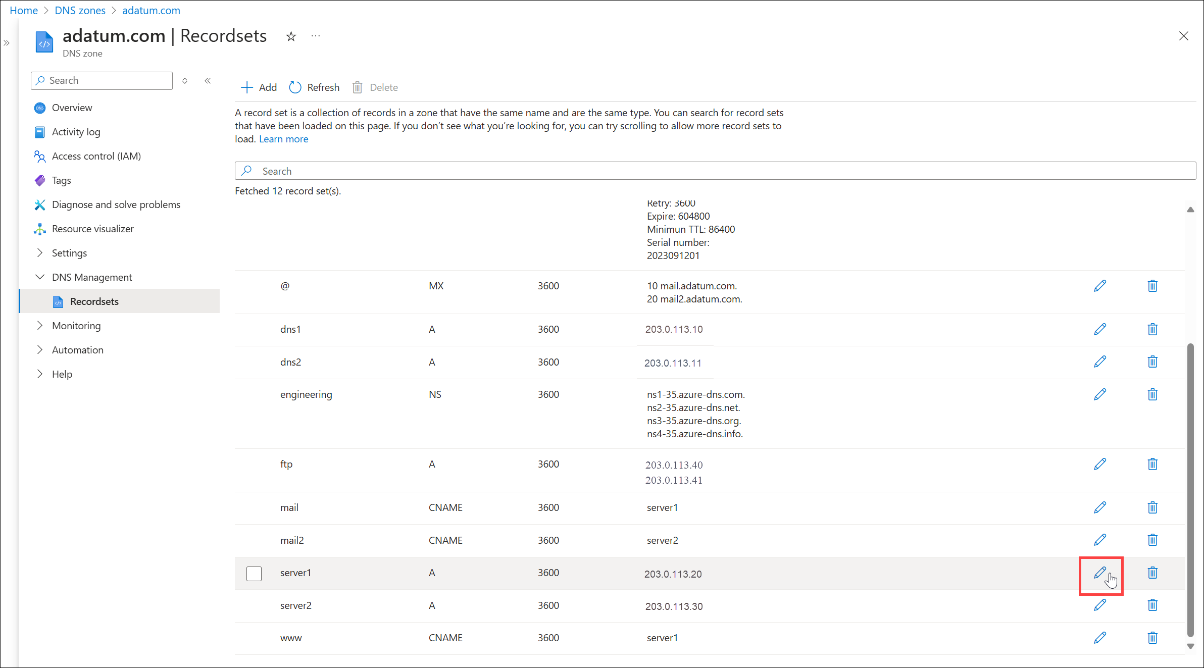 - On the Recordsets page for your DNS zone, select the edit icon next to the record set that you want to modify.