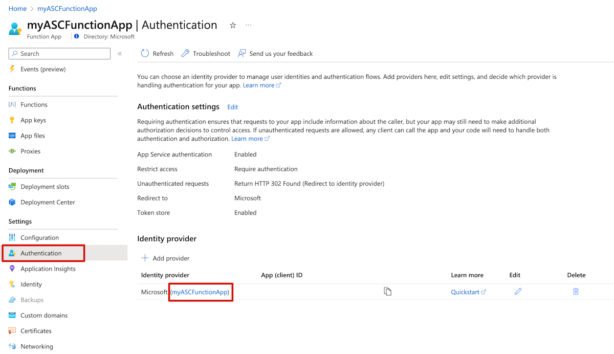 To get the Application ID, select Authentication in the navigation pane, and then copy the App (client) ID value for the identity provider that includes the name of the Function app.