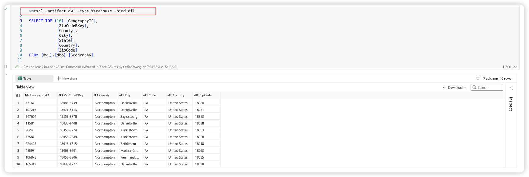 %%tsqlmagic command, include the parameter-sessionto establish the connection context. For example:%%tsql -artifact ContosoDWH -type Warehouse -session SELECT TOP(10) * FROM [ContosoDWH].[dbo].[Geography];Use line magic: After initializing the session, you can use