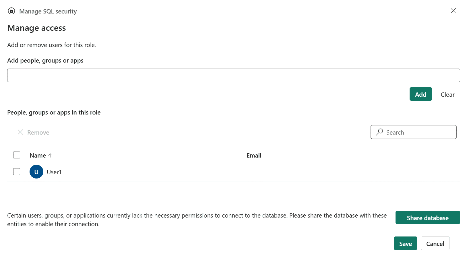 - If some of the role members, you're adding, don't have the Read item permission for the database in Fabric, the Share database button is displayed. Select it to open the Grant people access dialog and select Grant to share the database. Granting shared permissions to the database will grant the Read item permission to the role members who don't have it yet. For more information about sharing a SQL database, see Share your SQL database and manage permissions.
