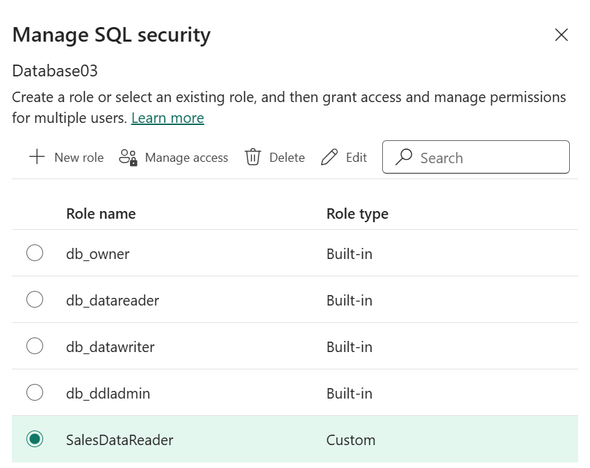 In the Manage SQL security page, select a built-in role or a custom role, and select Manage access.