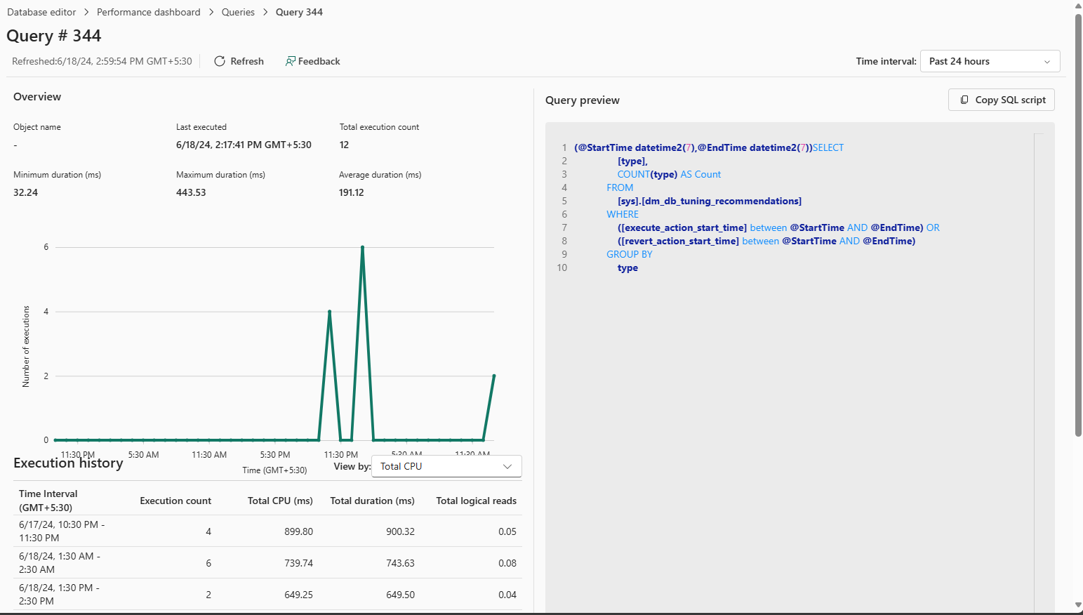 In the Queries tab, queries can be opened to troubleshoot the query details. Each query includes details including an execution history and query preview.