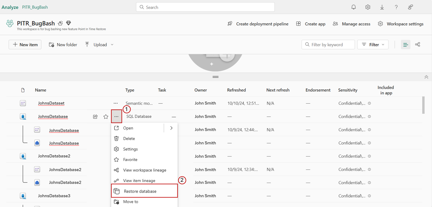 You can restore any database to an earlier point in time within its retention period. By performing this operation, you're actually creating a new SQL database in Fabric. When the restore is complete, Fabric creates a new database in the same workspace as the original database.