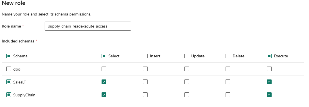 SalesLTandSupplyChainschemas. De-select all checkboxes except Select and Execute.Select Save.