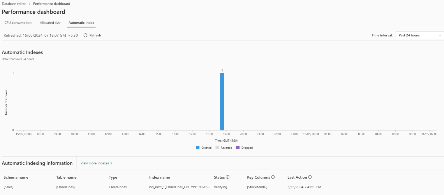 In the Fabric portal, the Automatic Index tab shows a history and status of automatically created indexes: