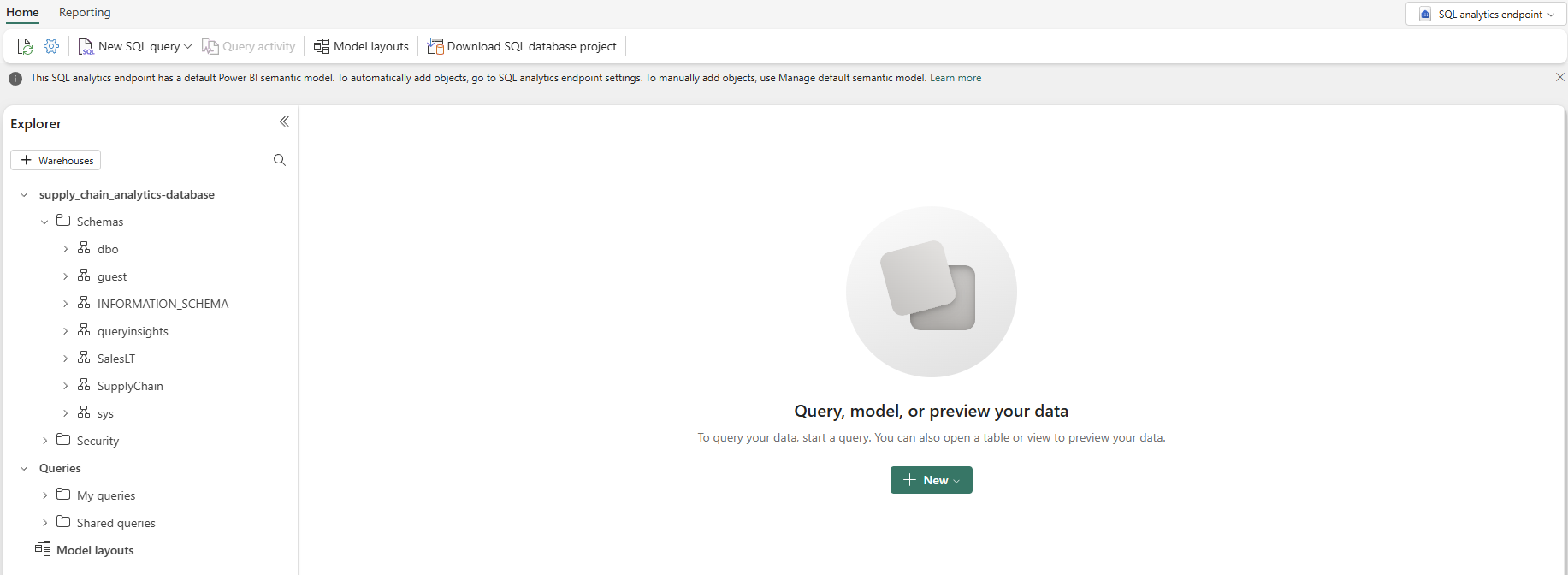 When you open the SQL analytics endpoint of the SQL database, you're brought to a view similar to the SQL database in Fabric view.