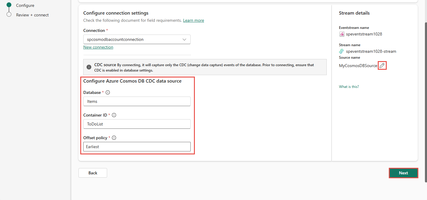 The Azure Cosmos DB Change Data Capture (CDC) source connector for Microsoft Fabric event streams lets you capture a snapshot of the current data in an Azure Cosmos DB database. The connector then monitors and records any future row-level changes to this data. Once the changes are captured in the eventstream, you can process this CDC data in real-time and send it to different destinations within Fabric for further processing or analysis.