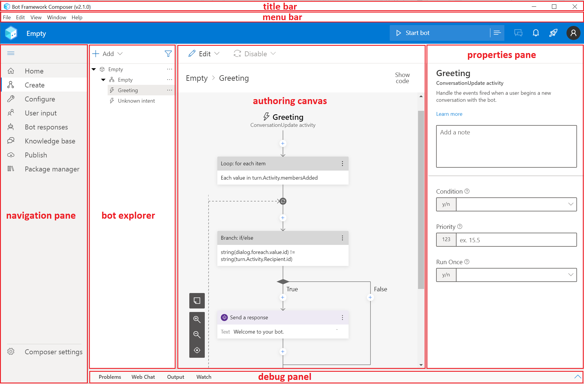 • Unknown intent - When the user sends a message or makes a request that the bot doesn't recognize, the bot sends a message telling the user it didn't understand the request. Here's a quick look at how your bot should look in the Composer UI. Composition of a Composer bot.