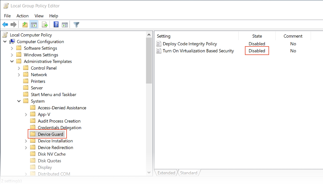 In the Local Group Policy Editor, navigate to Computer Configuration > Administrative Templates > System > Device Guard:
