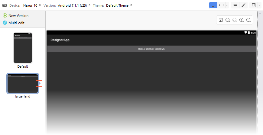 Note that the preview pane on the left displays the effects of the resource qualifier selections. Clicking Add creates the alternative layout and switches the Designer to that layout. The Alternative Layout View preview pane indicates which layout is loaded into the Designer via a small right pointer as indicated in the following screenshot: