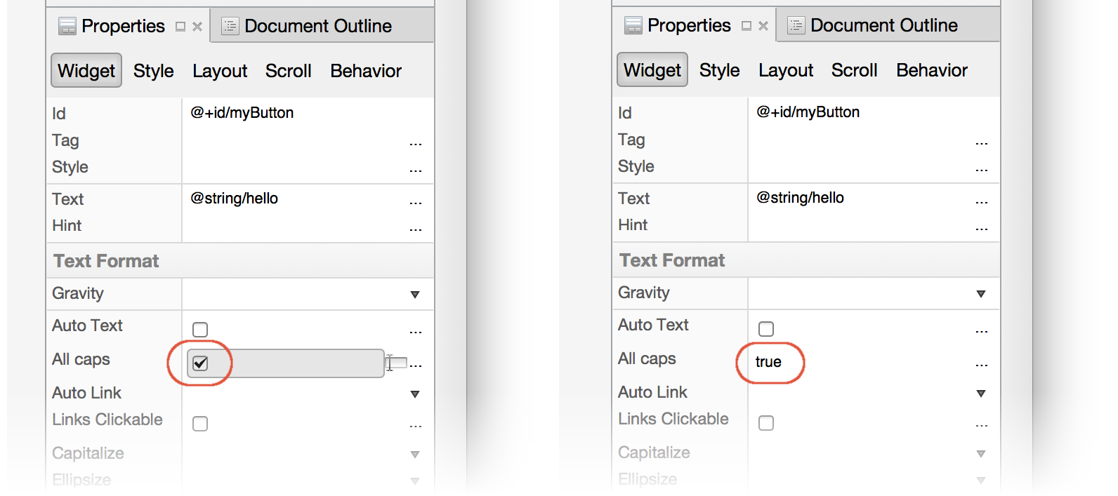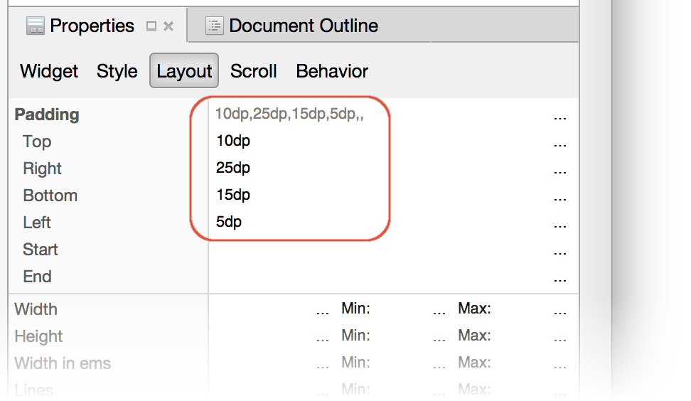 The Android Designer supports direct editing of certain properties on the Design Surface (so you don't have to search for these properties in the property list). Properties that can be directly edited include text, margin, and size.