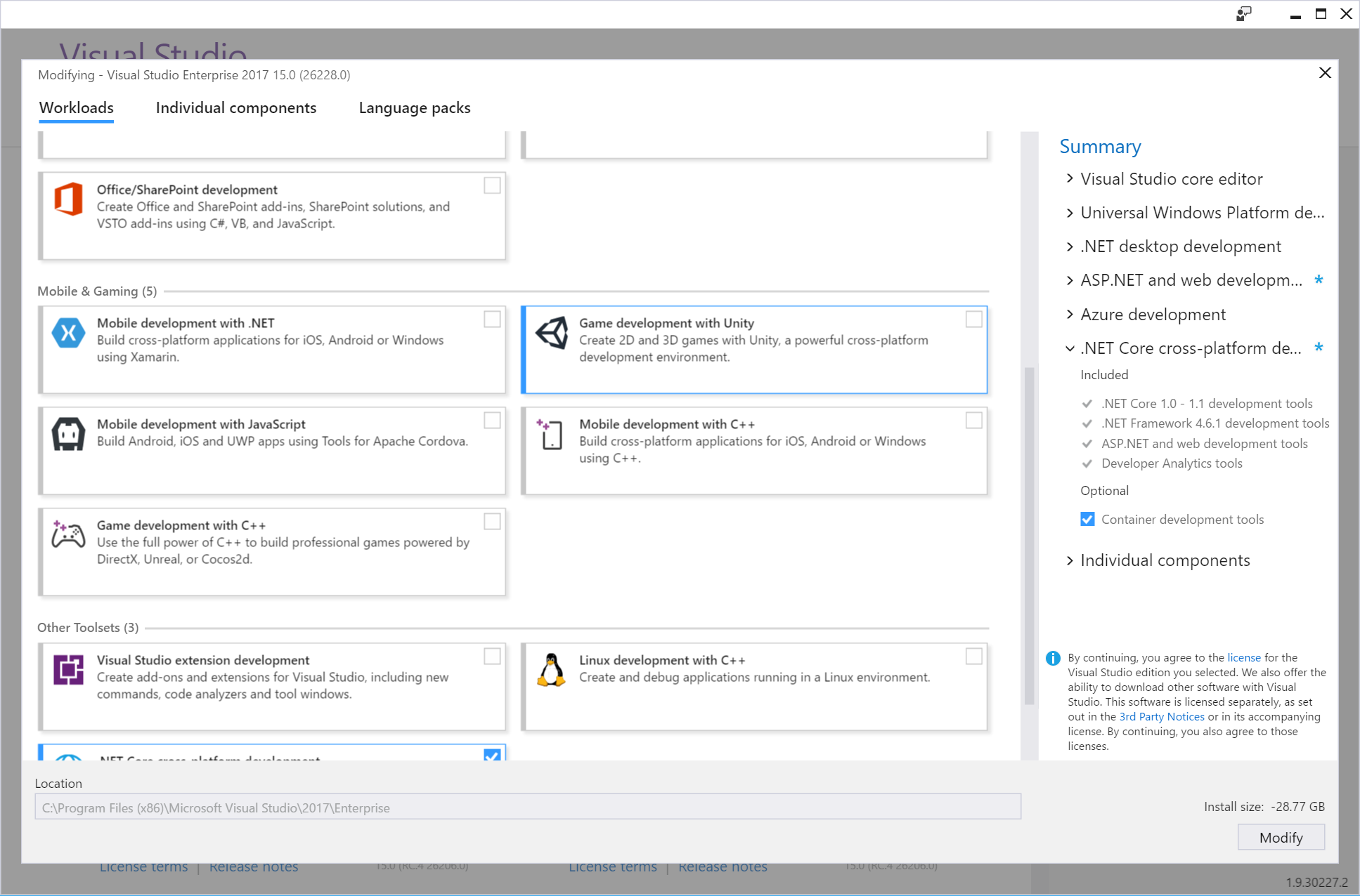 The installer will remove the de-selected components (Visual Studio 2017 must be closed before the installer can make any changes).