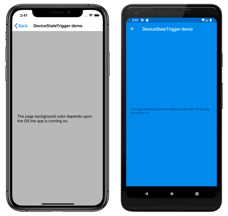 In this example, the explicit Style targets ContentPage objects. ContentPage objects that consume the style set their background color to silver on iOS, to pale blue on Android, and to aquamarine on UWP. The following screenshots show the resulting pages on iOS and Android: