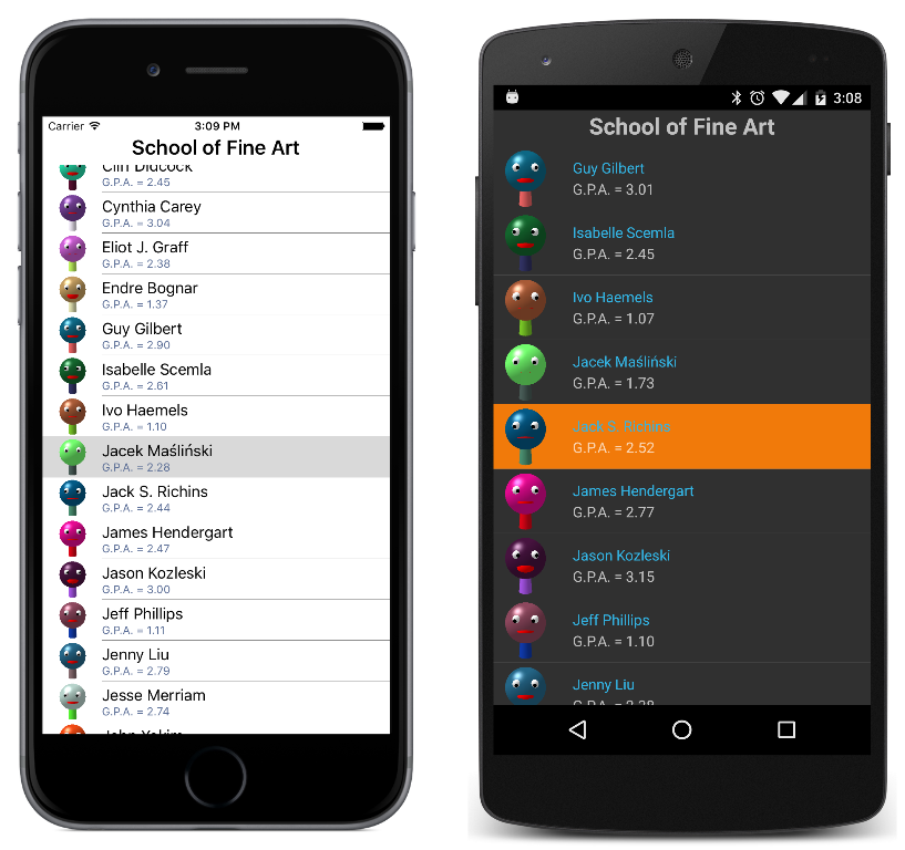 Sometimes you'll want slight variations in the visuals of the items in the ListView based on a property. For example, when a student's grade-point average falls below 2.0, the