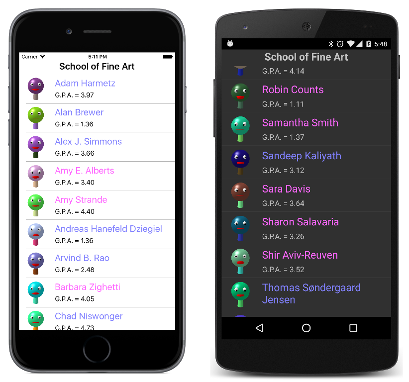 The GenderColors sample requires the SchoolOfFineArt library and sets the colors of the names of the students to blue or pink based on the Sex property: