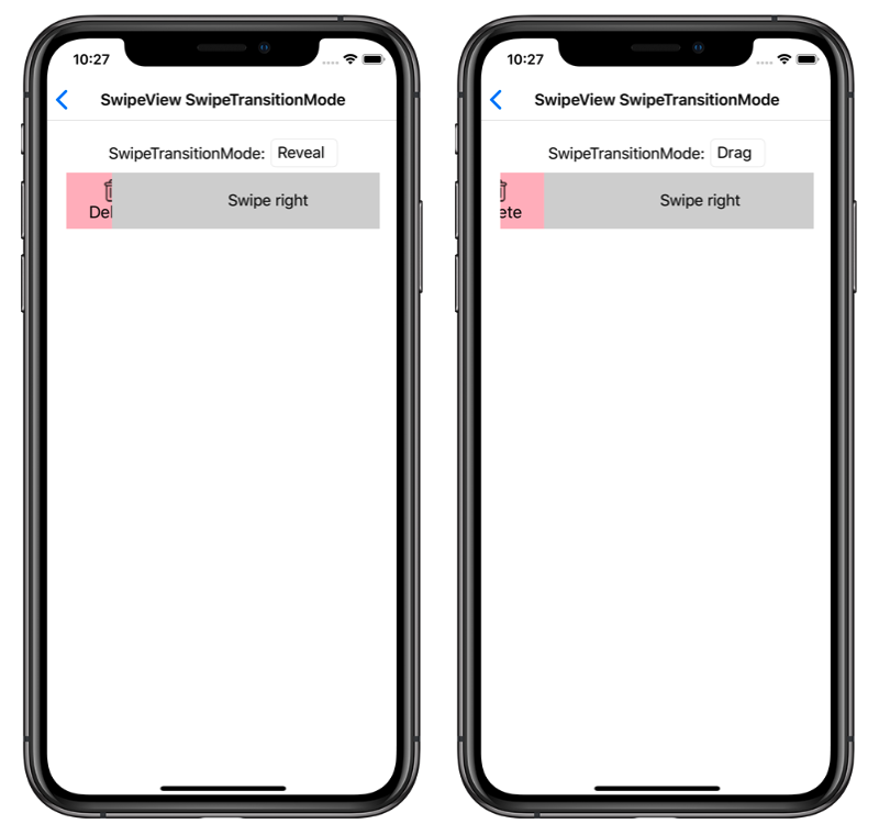 Revealindicates that the swipe items will be revealed as theSwipeViewcontent is swiped, and is the default value of theSwipeView.SwipeTransitionModeproperty.Dragindicates that the swipe items will be dragged into view as theSwipeViewcontent is swiped.