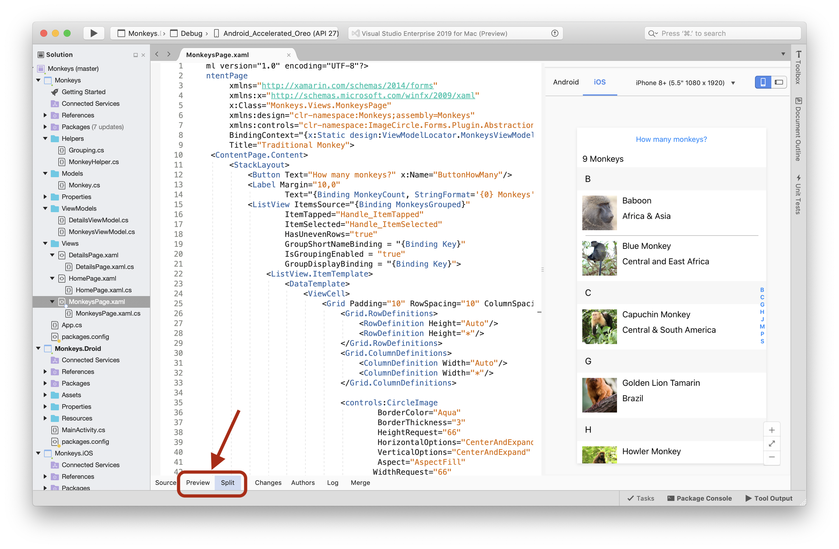 The XAML Previewer shows you how your Xamarin.Forms XAML page will look on iOS and Android. When you make changes to your XAML, you'll see them previewed immediately alongside your code. The XAML Previewer is available in Visual Studio and Visual Studio for Mac.