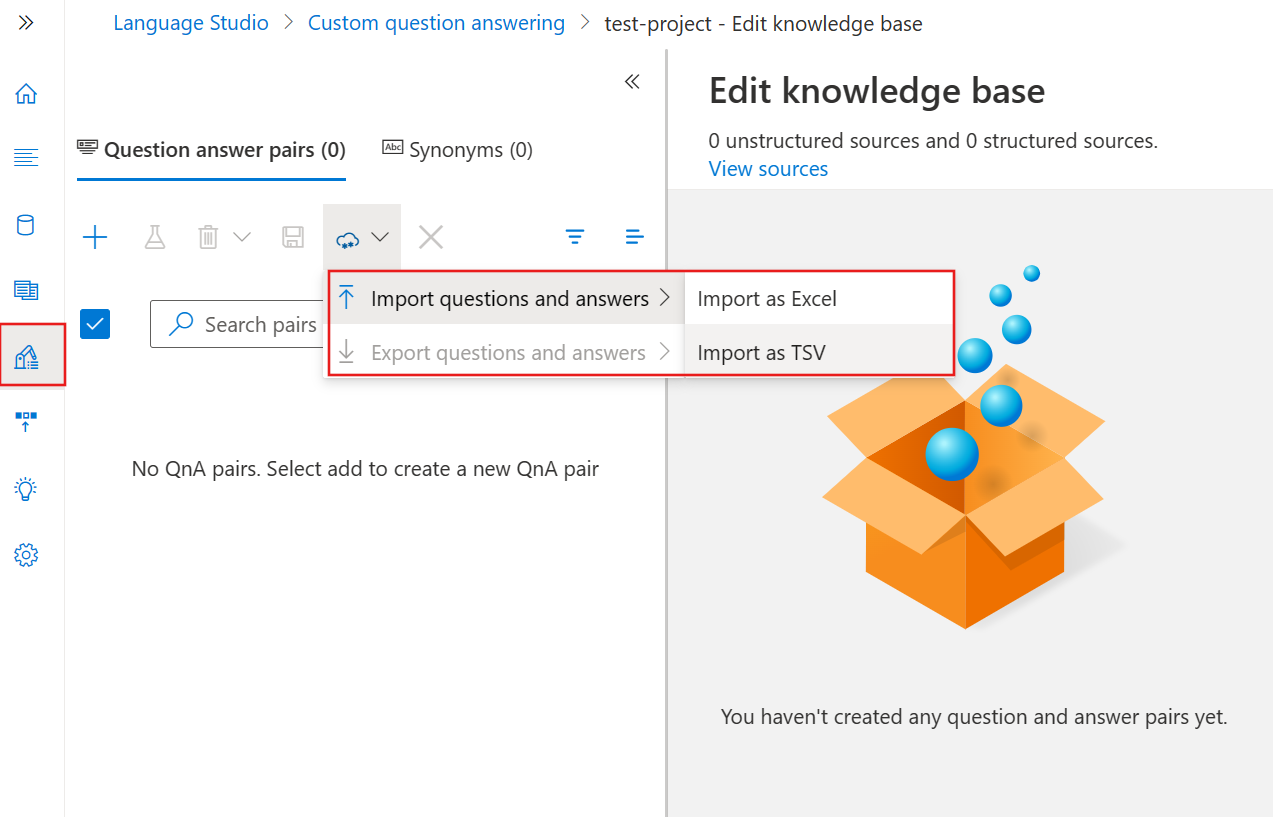 You create pairs of questions and answers in Language Studio for your project. You can also import a file that contains question and answer pairs to upload in bulk.