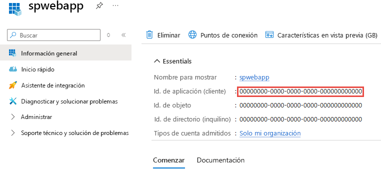 Al registrar la aplicación cliente, se proporciona información sobre la aplicación. Microsoft Entra ID proporciona un identificador de cliente, también denominado id. de aplicación, para asociar la aplicación con el entorno de ejecución de Microsoft Entra. Para más información sobre el identificador de cliente, consulte Objetos de aplicación y de entidad de servicio de Microsoft Entra ID.