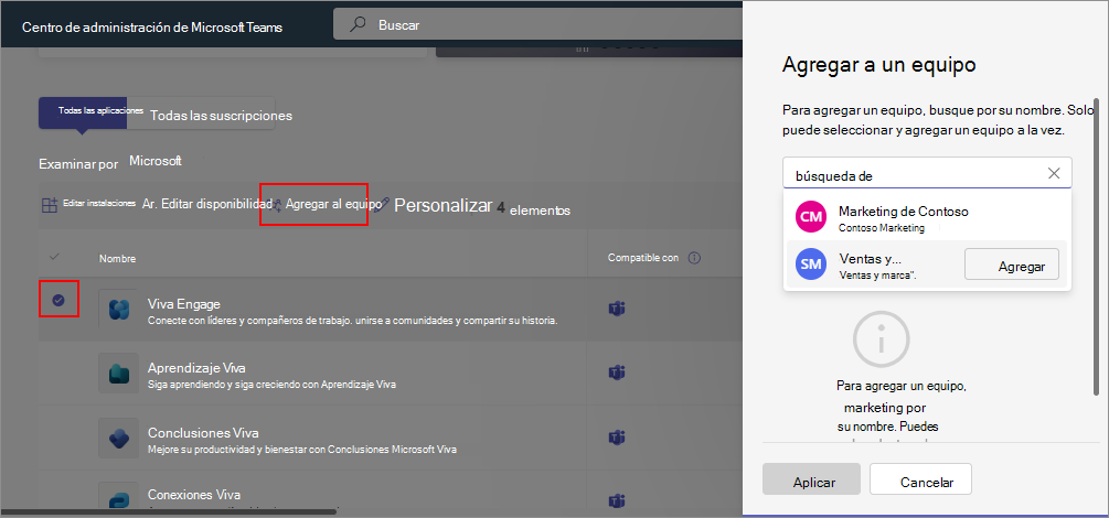 En el panel Agregar al equipo , busque el equipo al que desea agregar la aplicación, seleccione el equipo y, a continuación, seleccione Aplicar.