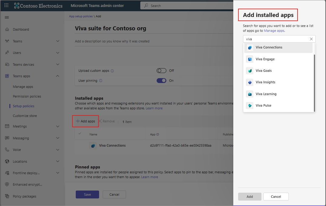 En el panel Agregar aplicaciones instaladas , busque las aplicaciones que desea agregar en el cliente de Teams de los usuarios permitidos. Seleccione Agregar.