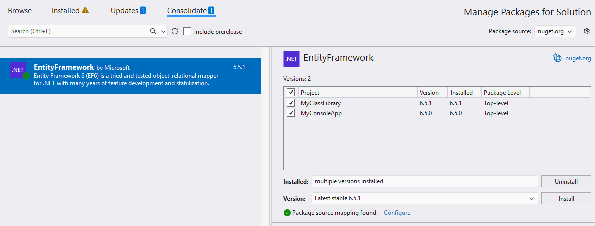 En este ejemplo, el proyecto MyClassLibrary usa EntityFramework 6.5.1, pero MyConsoleApp usa EntityFramework 6.5.0. Para consolidar las versiones del paquete, siga estos pasos: