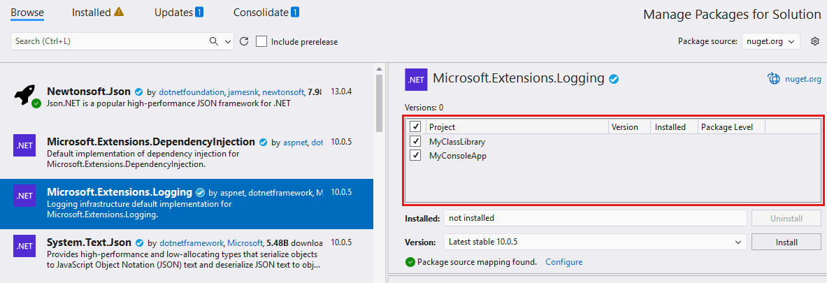 El Package Manager NuGet instala la versión del paquete seleccionado en todos los proyectos seleccionados y el paquete ya no aparece en la pestaña Consolidate.
