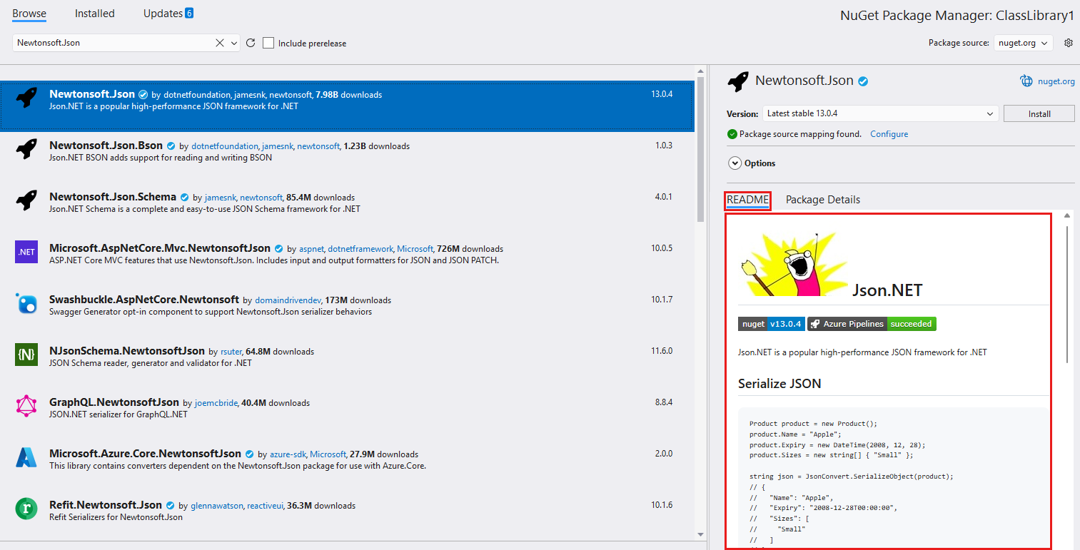 La pestaña LÉAME del panel de detalles muestra el archivo léame del paquete si lo proporciona el autor del paquete.