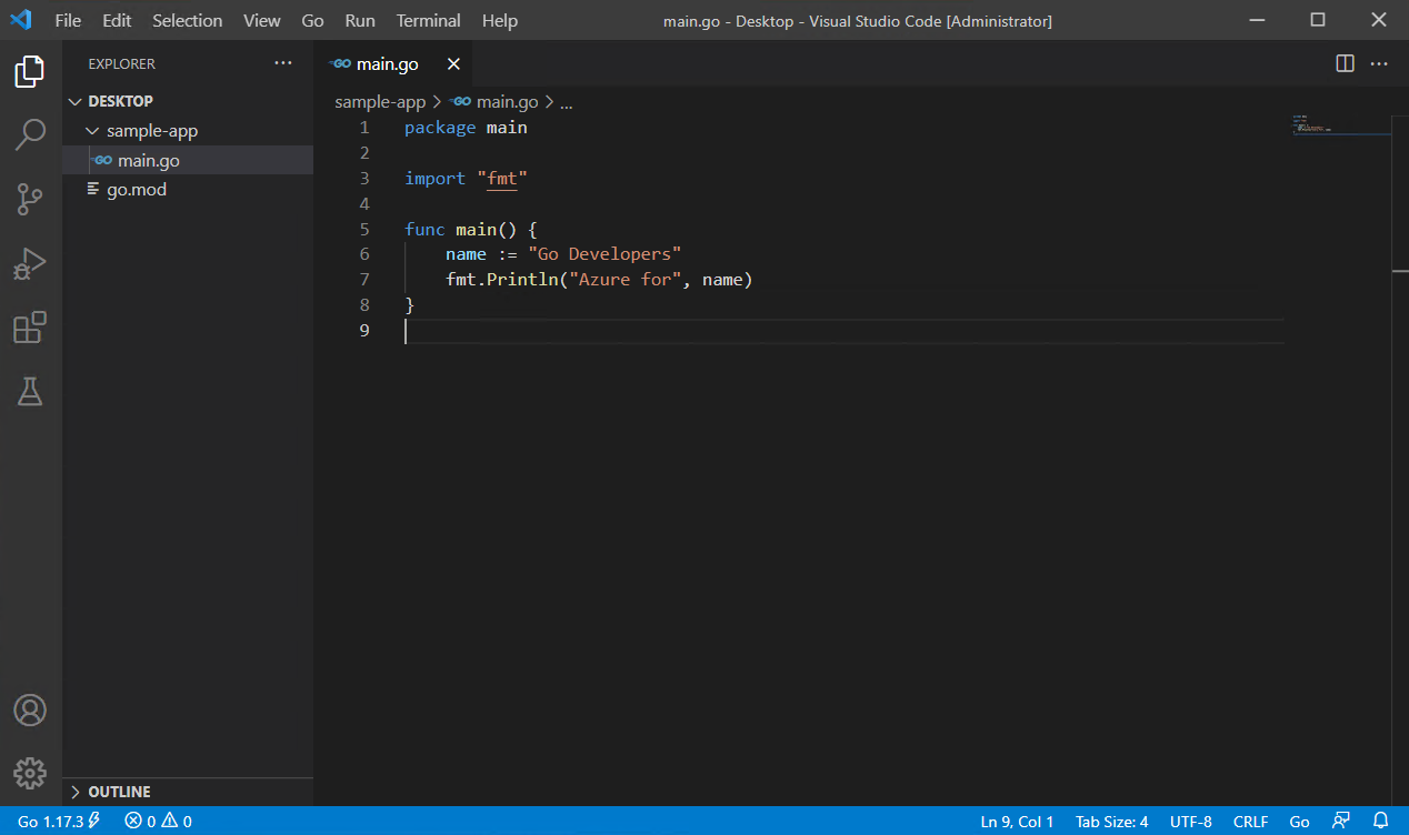 En este inicio rápido, instalará el compilador y las herramientas de Go, instalará Visual Studio Code para escribir código de Go e instalará la extensión Go para Visual Studio Code que proporciona compatibilidad al escribir Go. Una vez configurada, cree una aplicación, ejecútela y use la herramienta de depuración para pausar la ejecución y observar el valor de las variables.