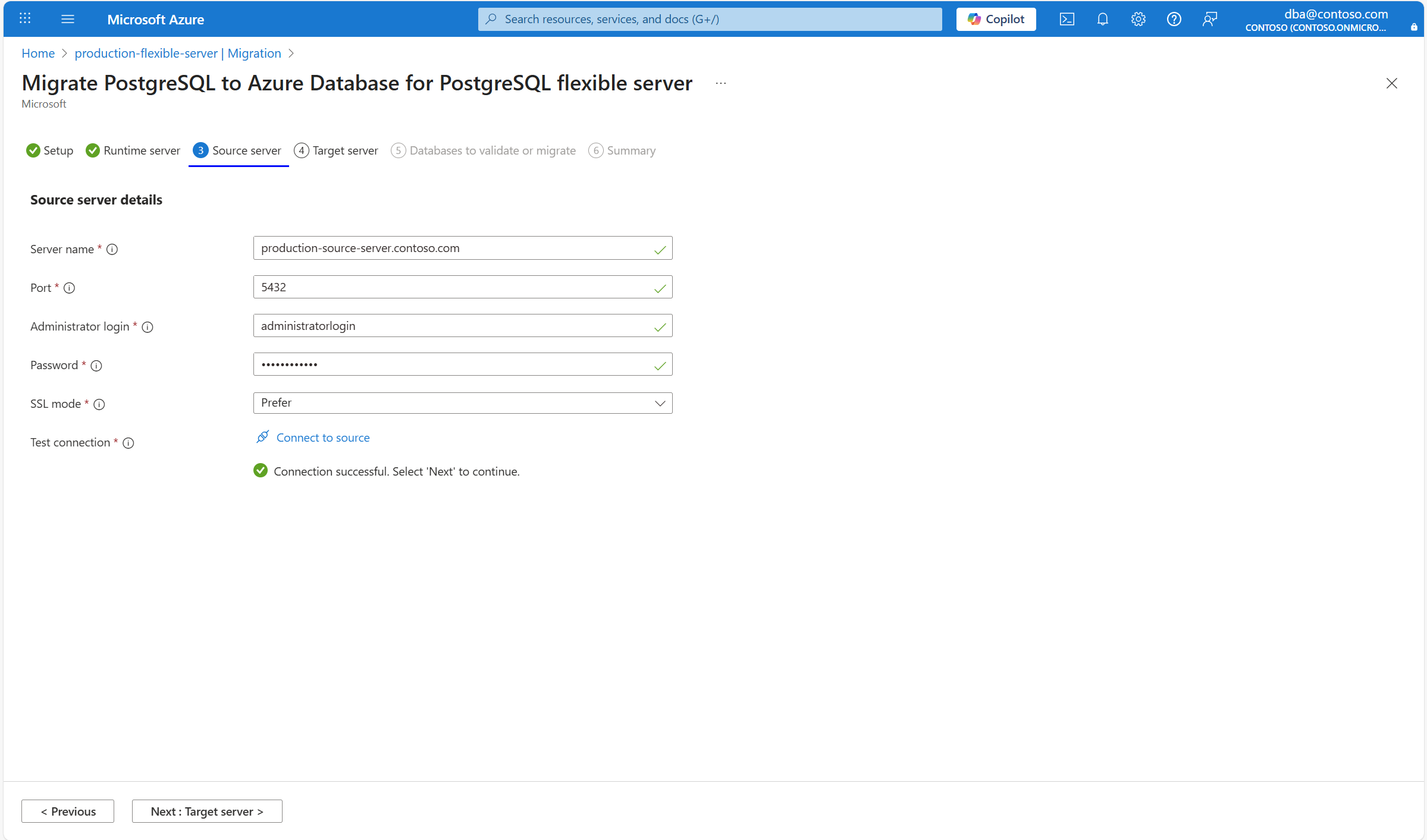 production-flexible-server.example.com,198.1.0.2o un FQDN de PostgreSQL, comoproduction-flexible-server.postgres.database.azure.com, si el servidor DNS personalizado contiene la zonapostgres.database.azure.comDNS o las consultas reenviadas de esta zona a168.63.129.16, donde el FQDN se resuelve en la zona DNS pública o privada de Azure. - Conexión de prueba : realiza la prueba de conectividad entre el origen y el destino. Una vez que la conexión se haya realizado correctamente, puede continuar con la pestaña siguiente. Estas pruebas tienen como objetivo identificar cualquier problema de conectividad que pueda existir entre los servidores de origen y de destino, incluida la comprobación de la autenticación mediante las credenciales proporcionadas. El establecimiento de una conexión de prueba tarda unos segundos.